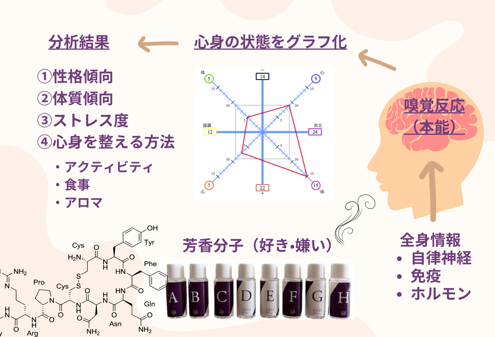 嗅覚反応分析は「嗅覚」がホメオスタシス(恒常性)を司る大脳辺縁系と密接に関係することを利用し、におい分子のイオン化傾向や薬理作用の化学反応から論理的・統計的・成分的なデータによって心身の状態を分析し視覚化したものです。